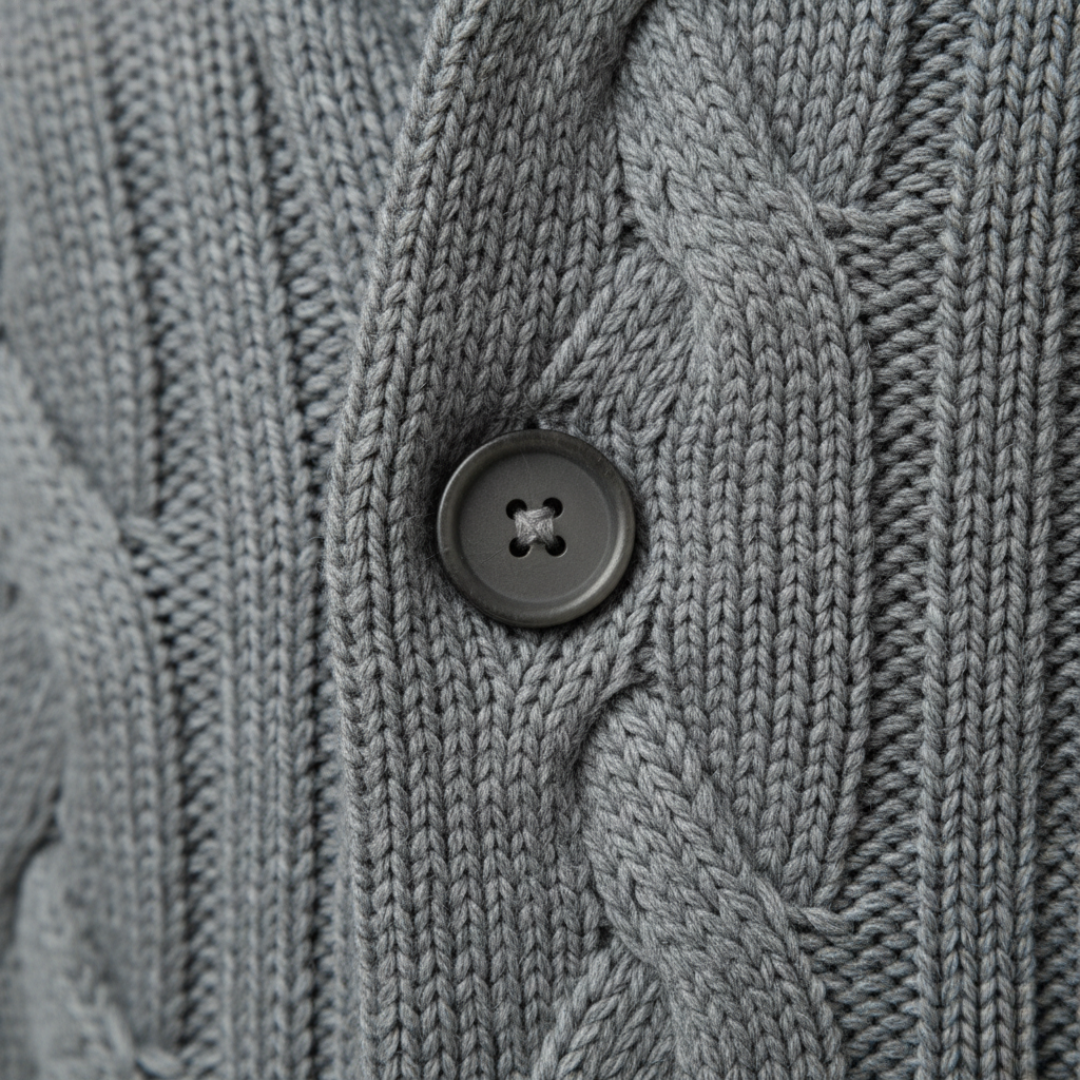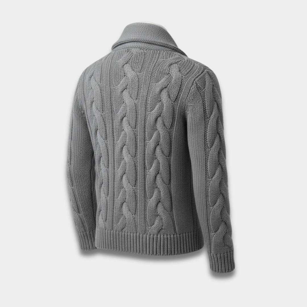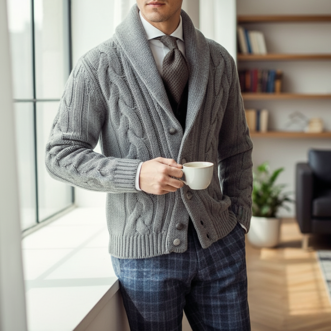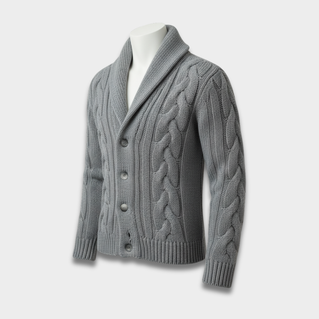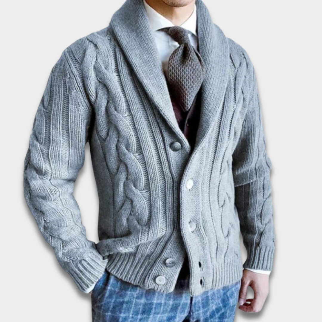 Męski kardigan z kołnierzem szalowym to klasyczny element garderoby o ponadczasowym kroju. Posiada wyrazisty splot warkoczowy oraz zapięcie na guziki, które nadają mu elegancki, a zarazem swobodny charakter.