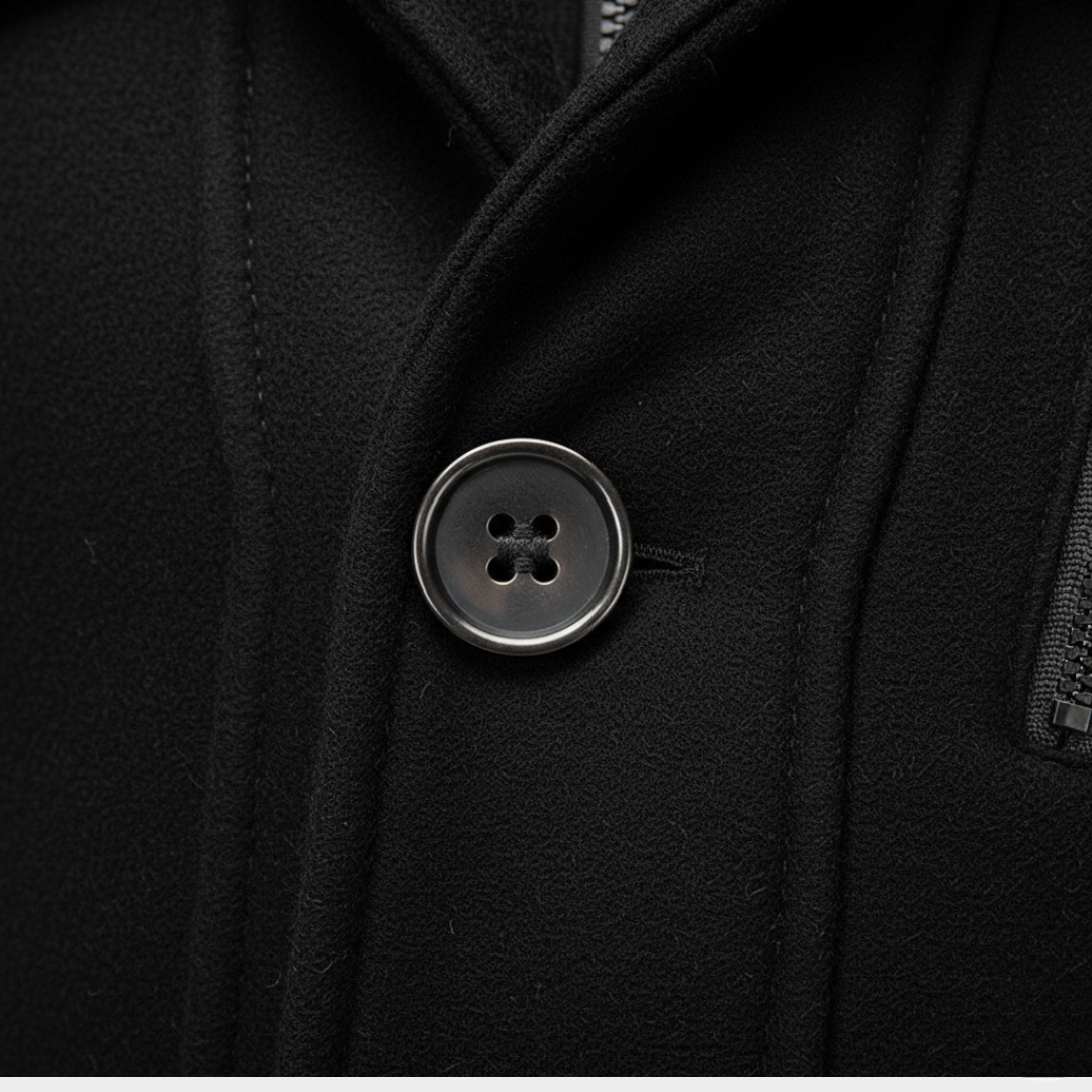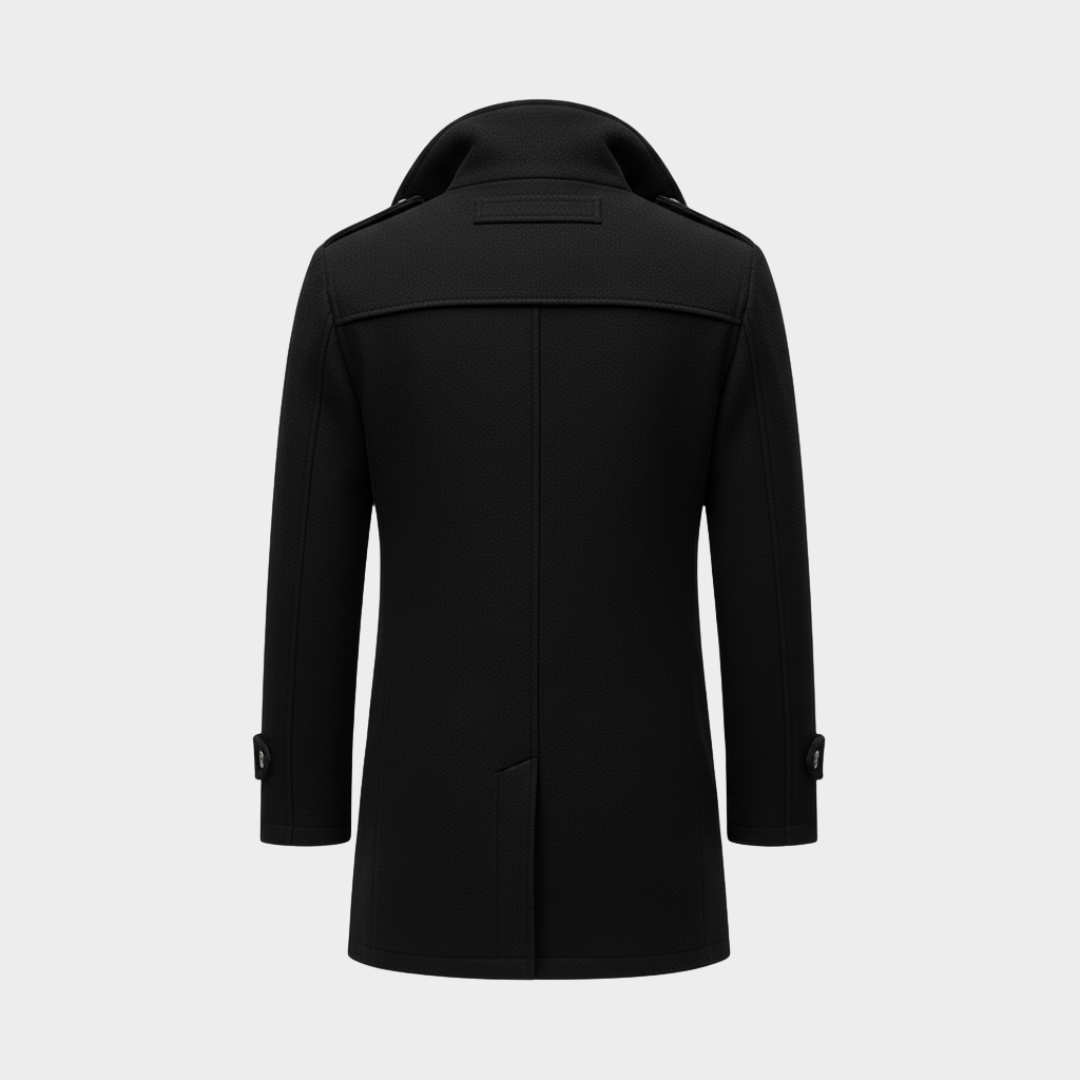 Męski płaszcz zimowy o klasycznym kroju z kołnierzem i zapięciem na guziki. Odpowiedni do codziennego noszenia w chłodne dni.